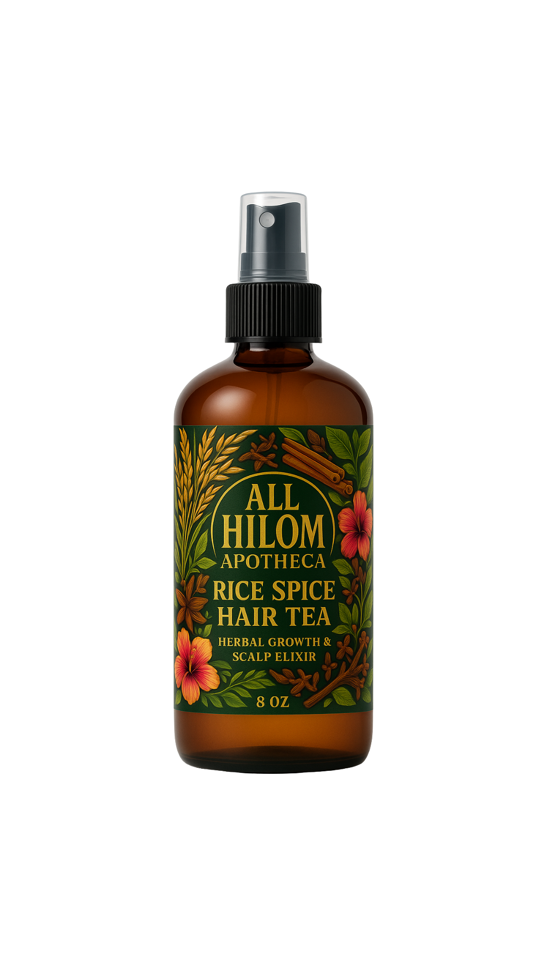 “All Hilom Rice Spice Hair Tea™” is a revitalizing herbal infusion designed to cleanse, stimulate, and fortify your crown. Whole rice kernels release amino acids that strengthen hair, while clove, cinnamon, and ginger invigorate the scalp. Moringa, hibiscus, and aloe soothe and hydrate, leaving hair soft, glossy, and fragrant.
